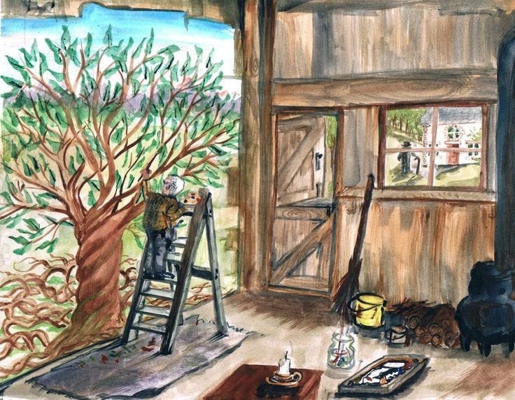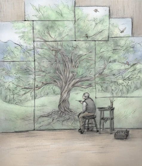 When the story opens, Niggle is working on a vast canvas: a picture of a huge tree with a background of forest and mountains. It’s his most ambitious work yet, with intricate, realistic detail, and while he’s obsessed with the idea of finishing it, he worries he won’t before the time for the unavoidable journey arrives.