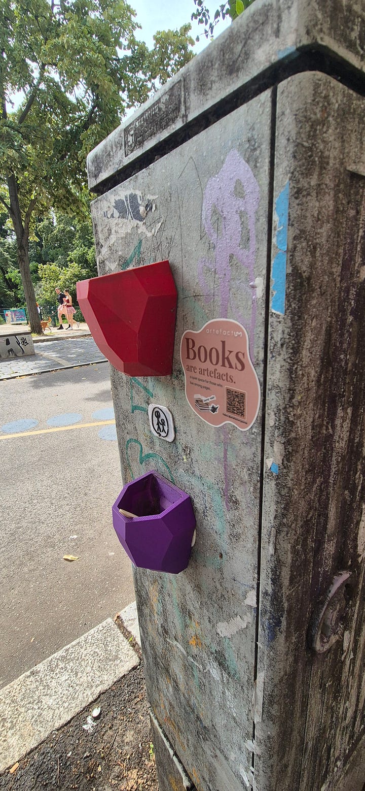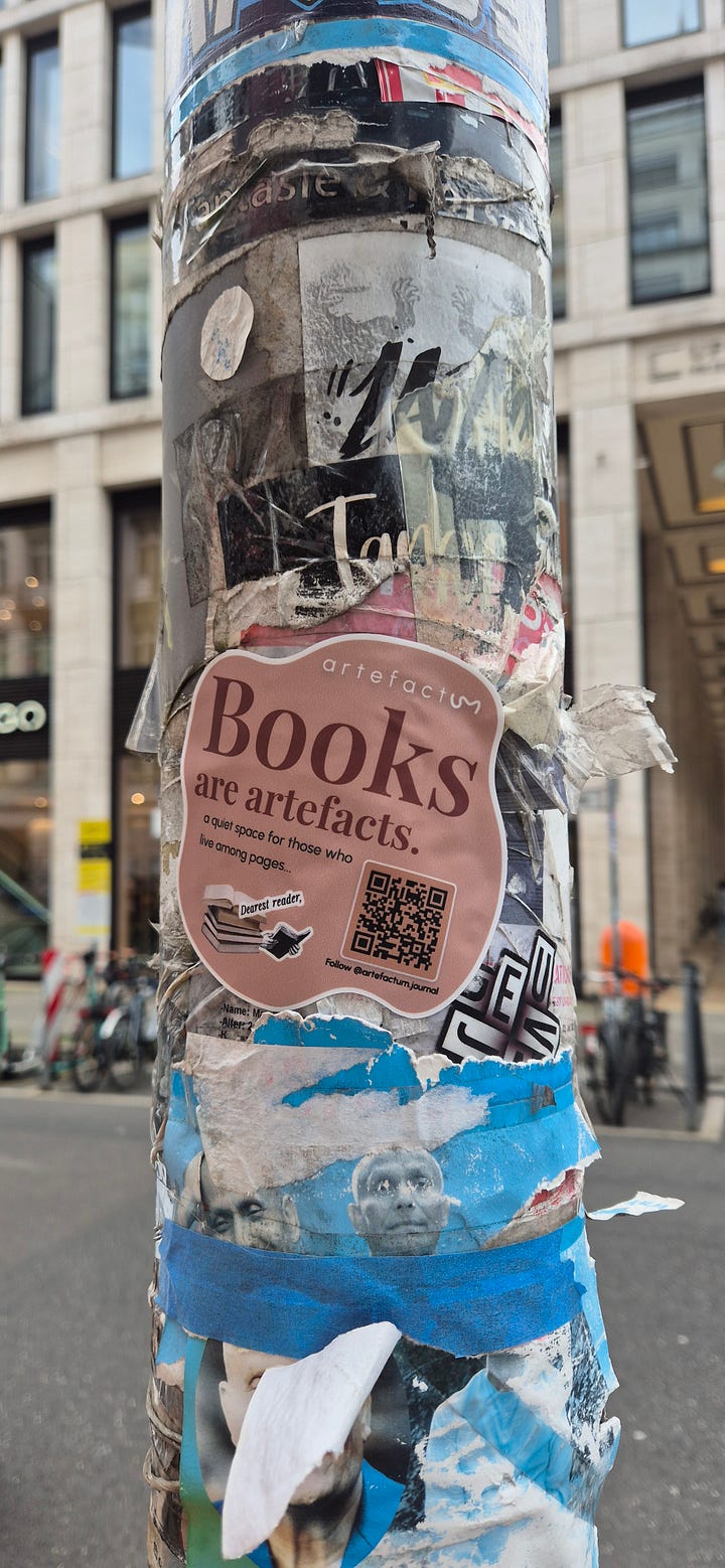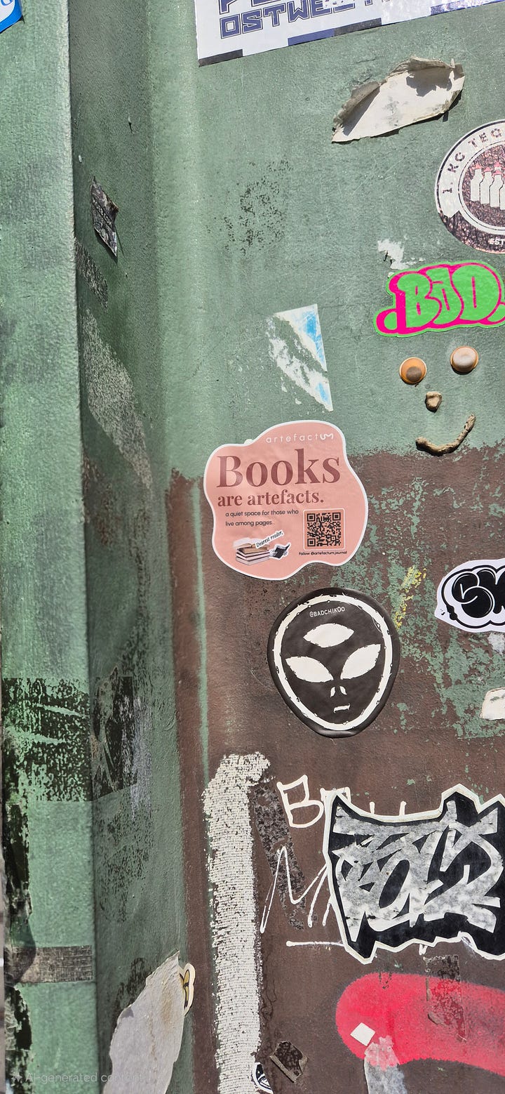 The sticker campaign is especially dear to me because it’s meant to feel cozy, approachable, slightly mysterious—much like Artefactum itself. It represents a passionate reader who is exploring the design world, sharing their reflections while letting the books take center stage. I chose not to show my face publicly in Artefactum to maintain this sense of mystery, to focus attention on the books themselves, and also for personal safety when sharing content with the wider world. It’s a little playful, a little secretive, and entirely in the spirit of discovering stories—both in books and in the streets.