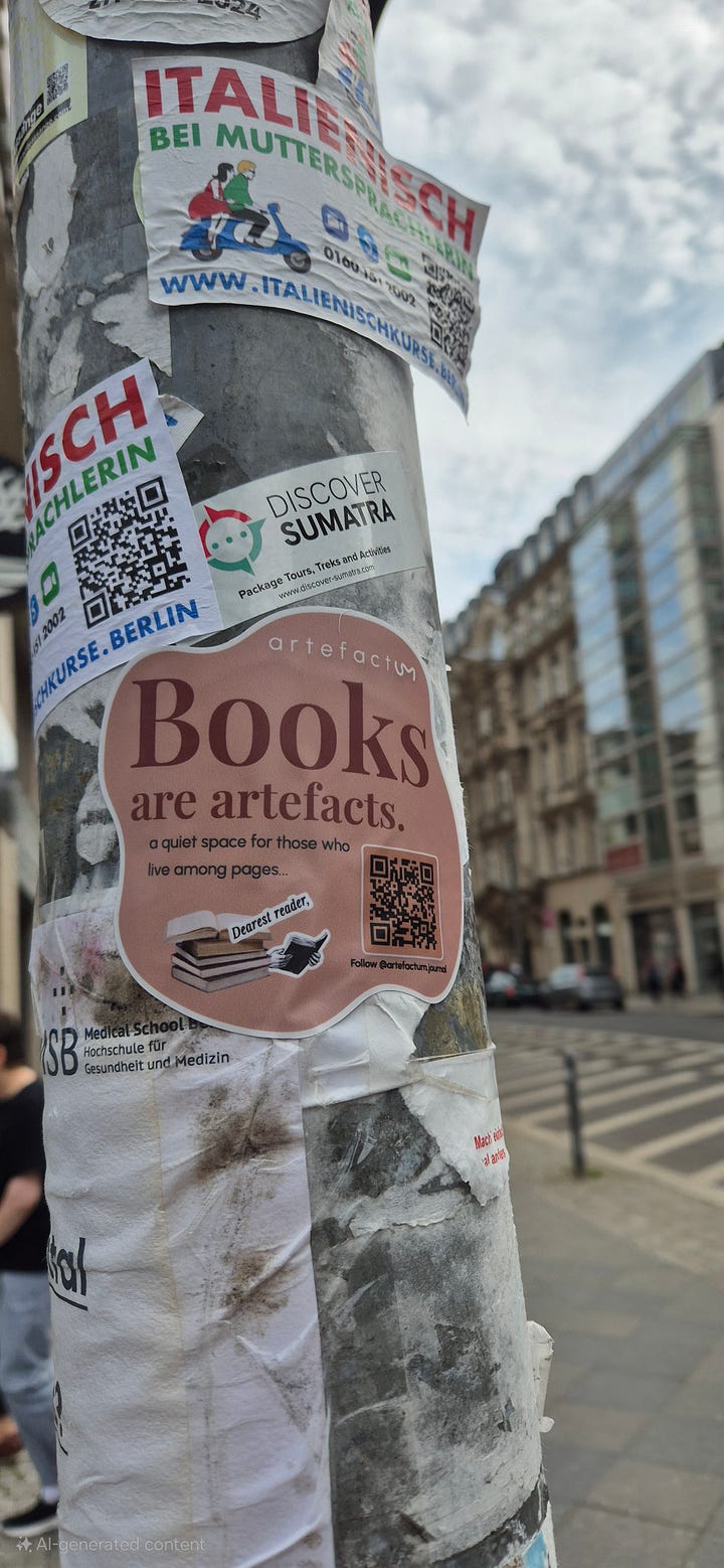 H: One of my favorite things about this project is your placement of Artefactum stickers in the streets of Berlin. I like that it frames the love for books as something public—as something that ought to be discovered by every passerby. When you started the page, did you have a particular audience in mind, or was it intended to be accessible by all?