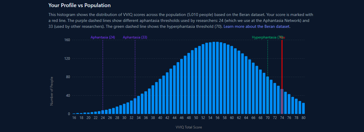 I did it myself a few days ago. A score of 74 has placed me as a hyperphantasic. Now I have to say—although the VVIQ is today’s gold standard for testing visualization, I remain a little skeptical of its accuracy. It is, after all, reliant on self-reporting. I don’t believe it captures the true complexity of the condition(s), especially as it only tests for the mind’s eye.
