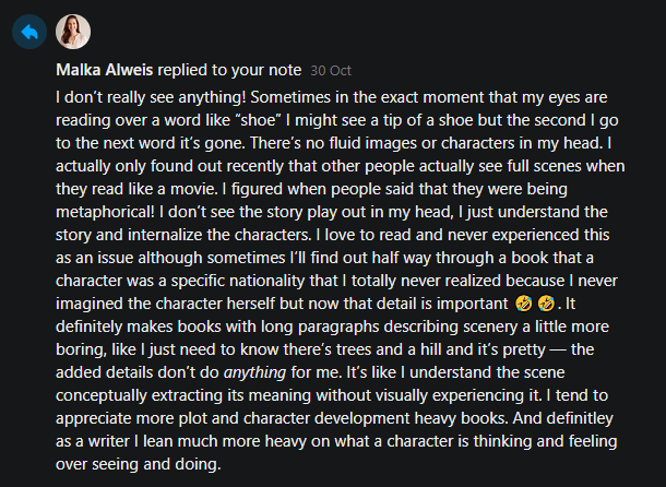 In October, I had a brief but intriguing interaction with aphantasic reader and writer Malka Alweis, writer of the publication Mom-Colored Glasses. She kindly shared what her experience with books is like, and I’ve found it aligns with what Dr. Deer has written: